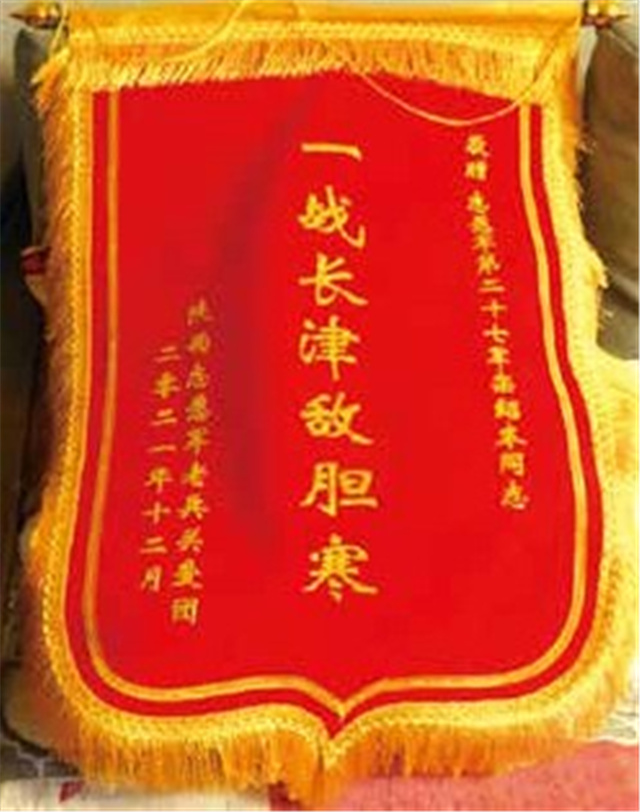2021年12月,陜西志愿軍老兵關愛團贈送給欒紹本的錦旗“一戰長津敵膽寒”。