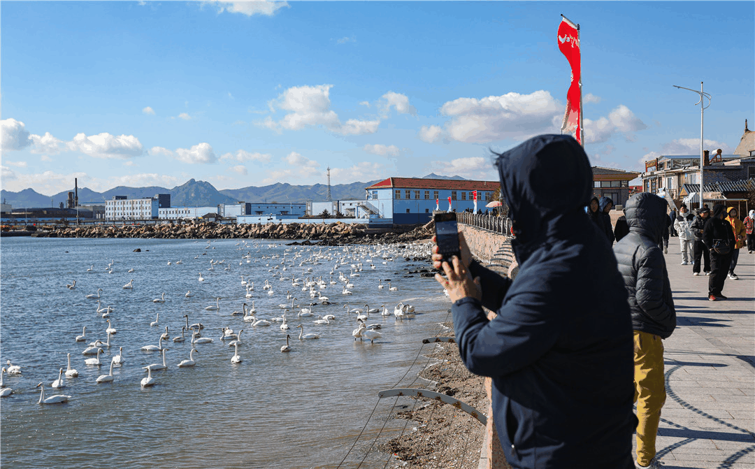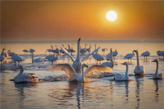 冬日的暖陽下,幾十只大天鵝在海灣沙灘上,游弋嬉戲、振翅高歌,為你上演一場美妙的“天鵝舞曲”。