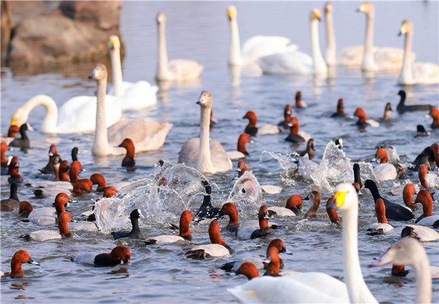 每年大約有一萬到一萬五千只大天鵝來威海棲息越冬,這里清澈富饒的海域,也為大天鵝提供了多種多樣的食物。
