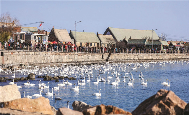 在古樸靜謐的煙墩角村,波光粼粼的水面上映著金燦燦的日光,一只只潔白優美的天鵝在水中游弋,歡歌曼舞,歲月靜好。天鵝飛過海草房,留下如童話世界般美景。