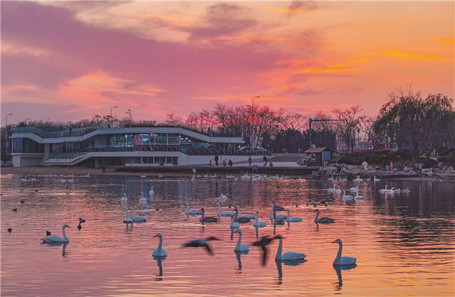 隆霞湖上坐落著亭臺樓閣,蘆葦飄搖,自成靚麗的風景。這里水清波柔、水質良好,湖內富足的藻類,每年吸引著數百只天鵝來此度假覓食。