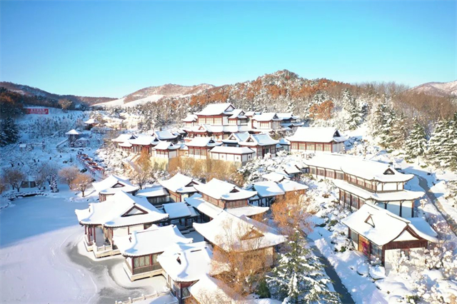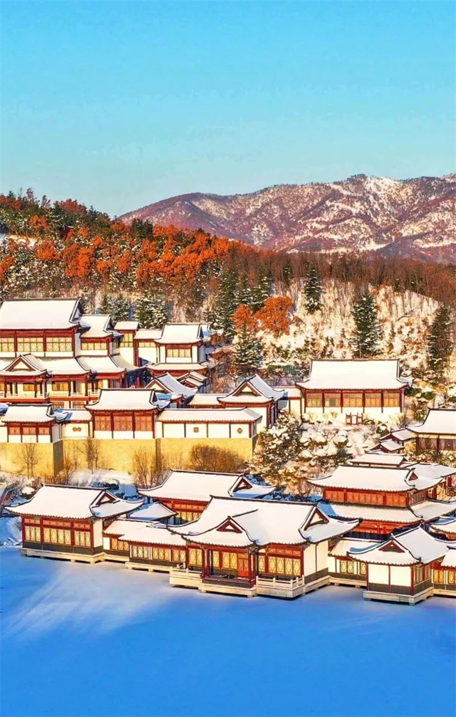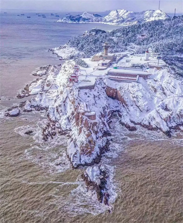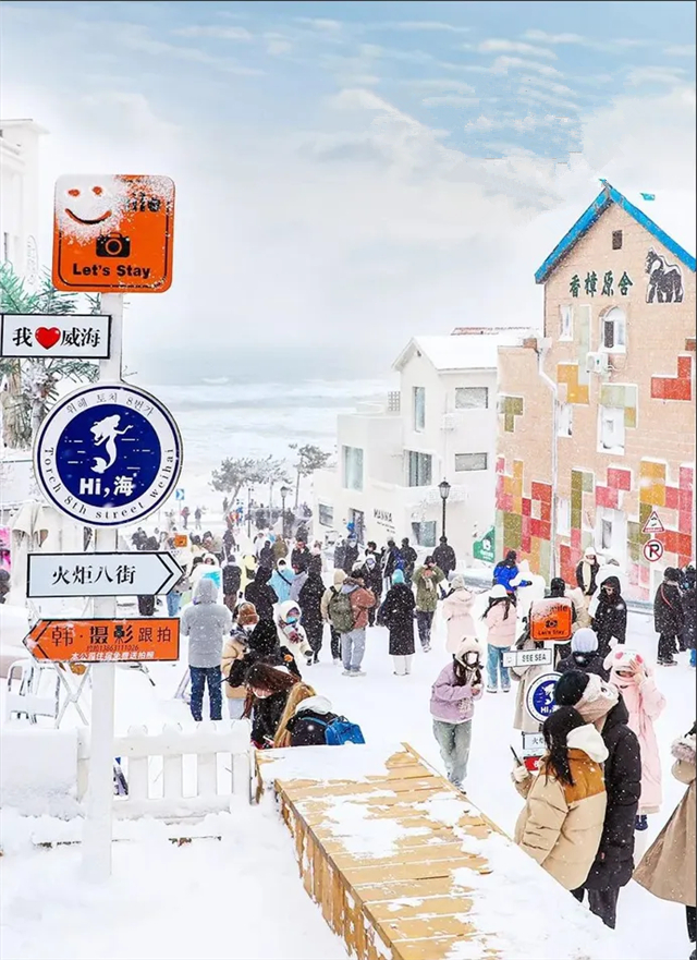 您可以感受威海的人文氣息,劉公島、棲霞街、環翠樓、華夏城的朱墻廊壁、廟宇宮闕,配上“銀裝素裹”,會讓人在恍惚之間不禁驚嘆“回眸已是越百年”。在火炬八街,散落在房頂的雪花“撞上”沿街童話小屋,滿滿的另類風情,分外明亮可愛。