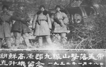 1952年1月,姜慶云與戰友在抗美援朝戰場被擊落的美軍直升機旁留念。