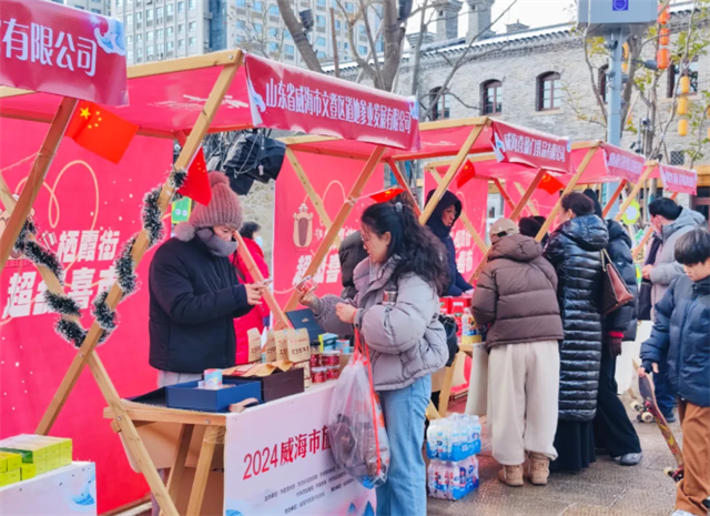 好客山東賀年會,幸福威海品至味。活動當天,棲霞街內樂隊演出、非遺市集、漢服游園等活動精彩不斷,人流絡繹不絕。由市文旅局創新打造的互動抽獎區人氣十足,“文旅盲盒”供不應求。