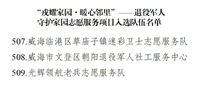 近日,退役軍人事務(wù)部思想政治和權(quán)益維護(hù)司、中央社會(huì)工作部志愿服務(wù)促進(jìn)中心、國家退役軍人服務(wù)中心、中國退役軍人關(guān)愛基金會(huì)聯(lián)合發(fā)布了“戎耀家園·暖心鄰里”——退役軍人守護(hù)家園志愿服務(wù)項(xiàng)目入選隊(duì)伍名單,威海有3支隊(duì)伍入選。