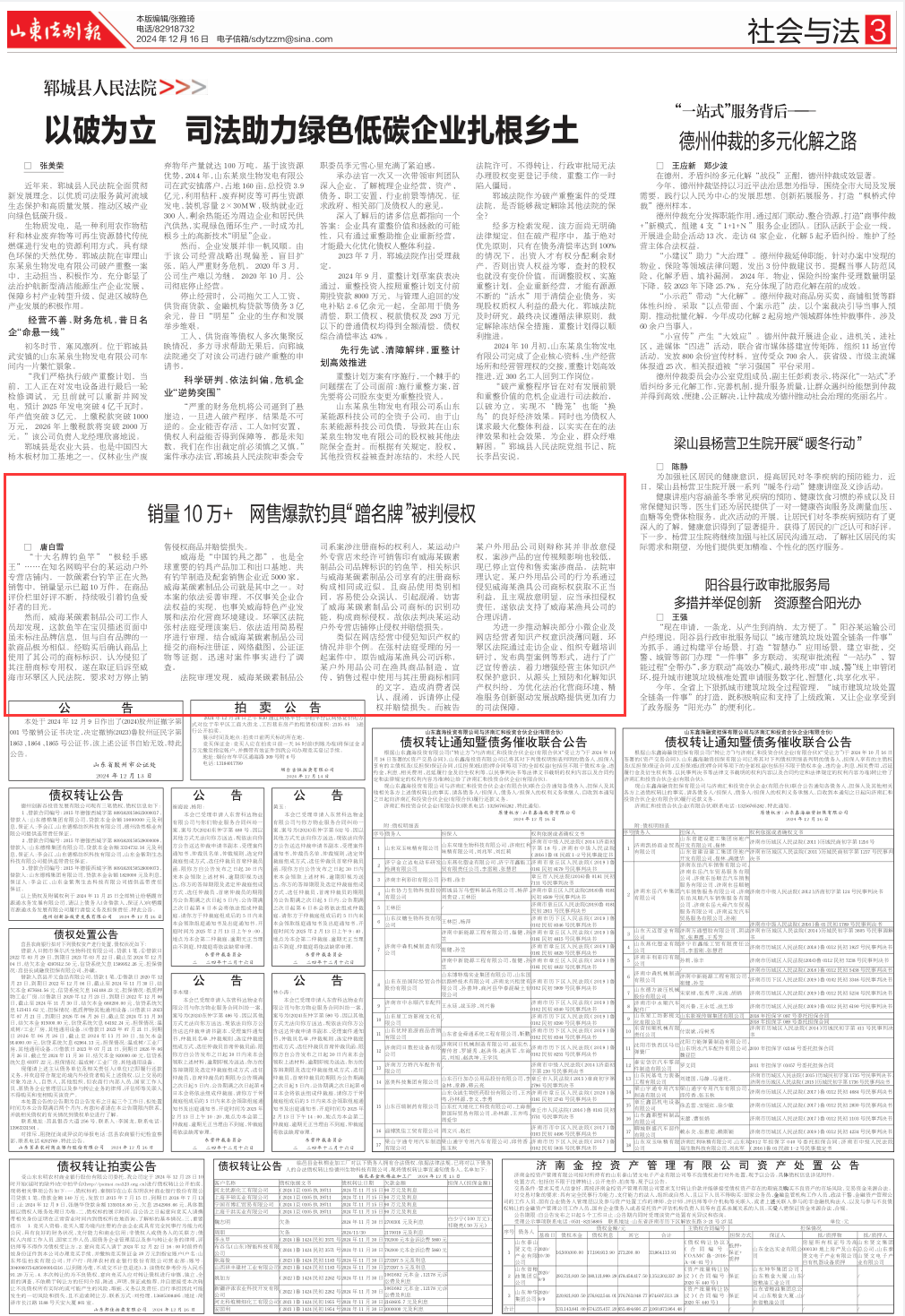 近日,《山東法制報(bào)》以《銷量10萬+網(wǎng)售爆款釣具“蹭名牌”被判侵權(quán)》為題,聚焦威海法院知識(shí)產(chǎn)權(quán)糾紛化解,以下為報(bào)道全文: