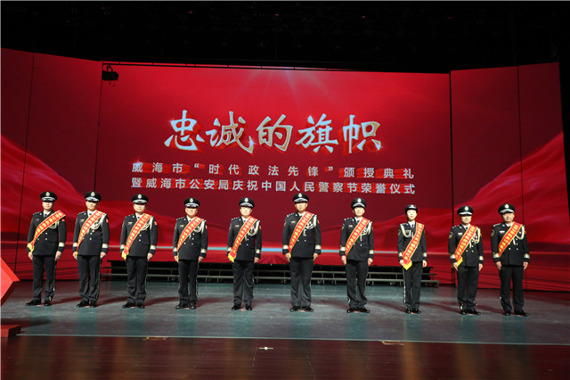 ???? “鐺,鐺,鐺!”1月9日下午3時,伴著三聲宏亮的鐘聲,冬日的威海再添一份莊重與熱烈——“忠誠的旗幟—威海市‘時代政法先鋒’頒授典禮暨威海市公安局慶祝中國人民警察節榮譽儀式”在市群眾藝術館海洋劇場拉開帷幕。