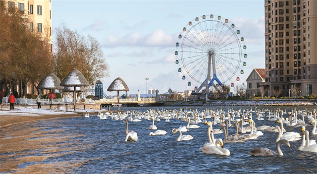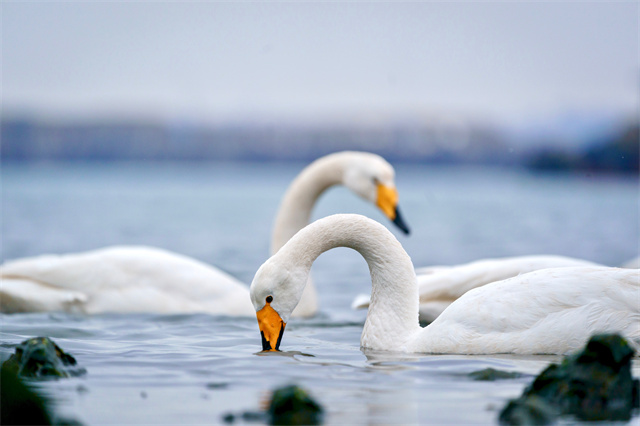天鵝作為象征“忠貞”的愛情鳥,一直備受人們的喜愛。在威海,你可以看到這些遠道而來的客人在一池冬水中引頸高歌、翩然飛舞。“萬頃湖天碧,一池雪花白。”眾多身姿優(yōu)美的天鵝棲息湖上,宛若一湖白雪,點綴在清澈潔凈的水面上。