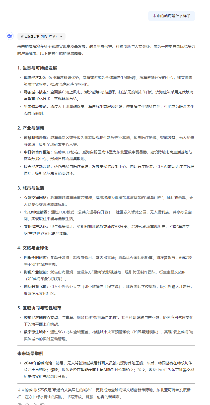 帶著好奇,小編問(wèn)了DeepSeek有關(guān)威海的問(wèn)題,想看看AI眼中的威海是什么樣的。