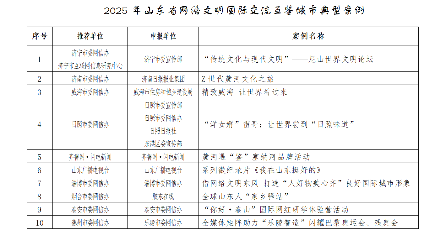 經過嚴格的評選程序,包括“‘傳統文化與現代文明’——尼山世界文明論壇”“Z世代黃河文化之旅”“精致威海讓世界看過來”在內的10個典型案例脫穎而出,它們展現了山東省在網絡文明國際交流領域的積極探索和生動實踐。