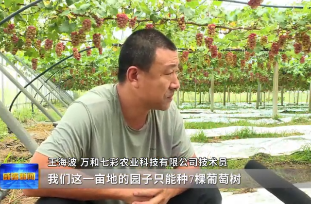 ????????萬(wàn)和七彩農(nóng)業(yè)科技有限公司技術(shù)員王海波說(shuō),看樹有多粗,他們這一畝地的園子只能種7棵葡萄樹,這一棵能占一分多地。