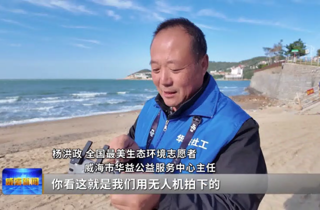 全國最美生態環境志愿者、威海市華益公益服務中心主任楊洪政說,這就是用無人機拍下的一些陡峭的礁石旁邊的漂浮物,這塊人下不來也看不著,這時候無人機就派上用場了,像威海灣就有20個這樣的無人機監測點位,發現問題后,他們上報相關部門,在天氣允許情況下派船只和志愿者過來打撈。