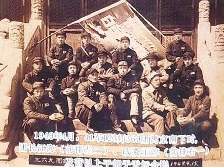 1949年4月,四十一軍一二三師三六九團離京南下時,團長江海(前排左二)、政委王淳(前排右一)及營以上干部于天壇合影。