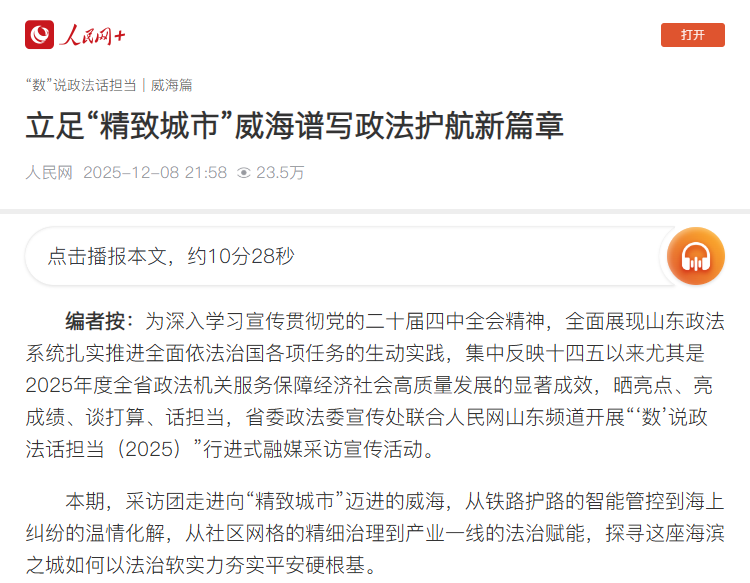 12月8日,人民網刊發《立足“精致城市”威海譜寫政法護航新篇章》,報道威海將政法工作深度融入精致城市建設全過程,為開創“精致城市·幸福威海”新局面提供堅實法治保障的工作成效。以下是報道全文: