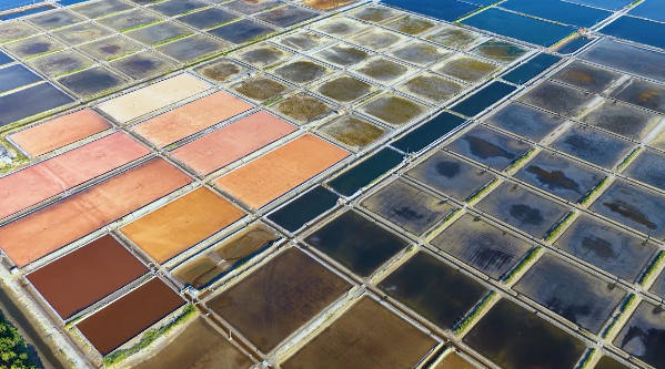 ????????威海南海新區高島鹽場,從空中俯瞰,一塊塊規整的鹽田如大自然精心調配的巨型調色板,紅、粉、綠、藍、棕等色彩層層鋪展、交錯輝映,在陽光照耀下折射出粼粼波光與夢幻光澤,構成一幅人與自然共同創作的絕美生態畫卷。這片鹽田的絢麗色彩,源于自然饋贈與傳統工藝的深度交融。威海南海新區坐擁潔凈無污染的海域環境,海水鈉鎂比值得天獨厚,為優質海鹽生產奠定了天然基礎。作為擁有60余年歷史的非遺古法日曬海鹽場,高島鹽場始終堅守傳統技藝,摒棄機械干預,完全依托日照與海風的自然力量,讓海水在280天的漫長周期中循序漸進地完成蒸發、濃縮與結晶。隨著蒸發程度梯次加深,鹽田內海水濃度逐步變化,水中微生物群落與礦物質含量隨之改變,最終暈染出從淺綠到深紅、從湛藍到棕黃的豐富色調,每一塊鹽田都成為獨一無二的“自然調色盤”。漫步鹽田之間,既能近距離觀摩“納潮、制鹵、結晶、收鹽”的古法曬鹽全過程,觸摸非遺技藝的傳承脈絡,又能沉浸式感受這片“彩色海洋”的視覺震撼。