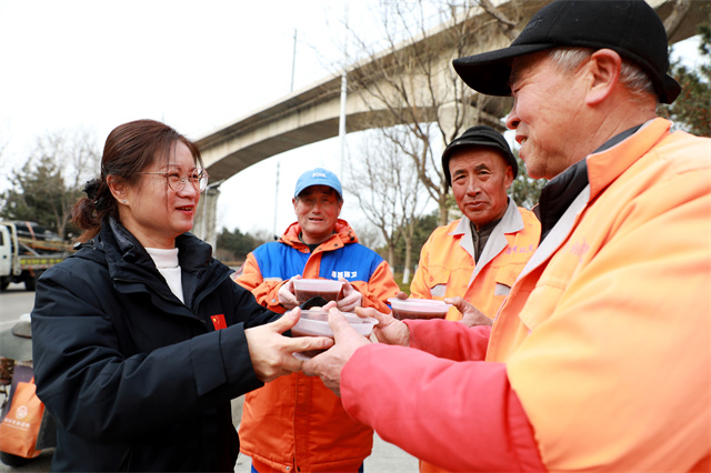 ????????志愿者將臘八粥免費送給環衛工人。