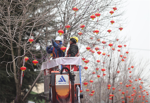 ????????當天,在市區人民廣場,園林工人正在安裝節日彩燈,營造節日氛圍;在文化中路,施工人員將一串串喜慶的彩燈懸掛在道路兩側的樹枝上,燈籠高掛,年味漸濃。