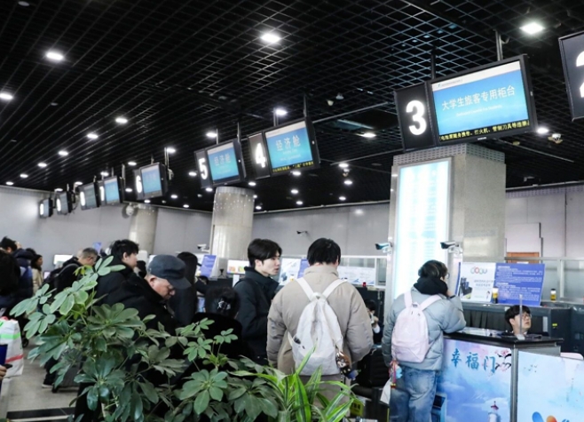 ????????2月2日8時(shí)許,威海站候車大廳已是人頭攢動(dòng)。旅客們帶著大包小包,在晨光中有序進(jìn)站候車。在威海工作的河南人劉超,行李中塞滿了海鮮等特產(chǎn)。望向歸途,他眼里滿是回家的期盼。