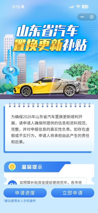 ????????擬申請補(bǔ)貼的個人消費(fèi)者最晚應(yīng)于2027年1月10日前,通過“愛山東”、微信、支付寶、懂車帝搜索“山東省汽車置換更新”小程序進(jìn)行申報。