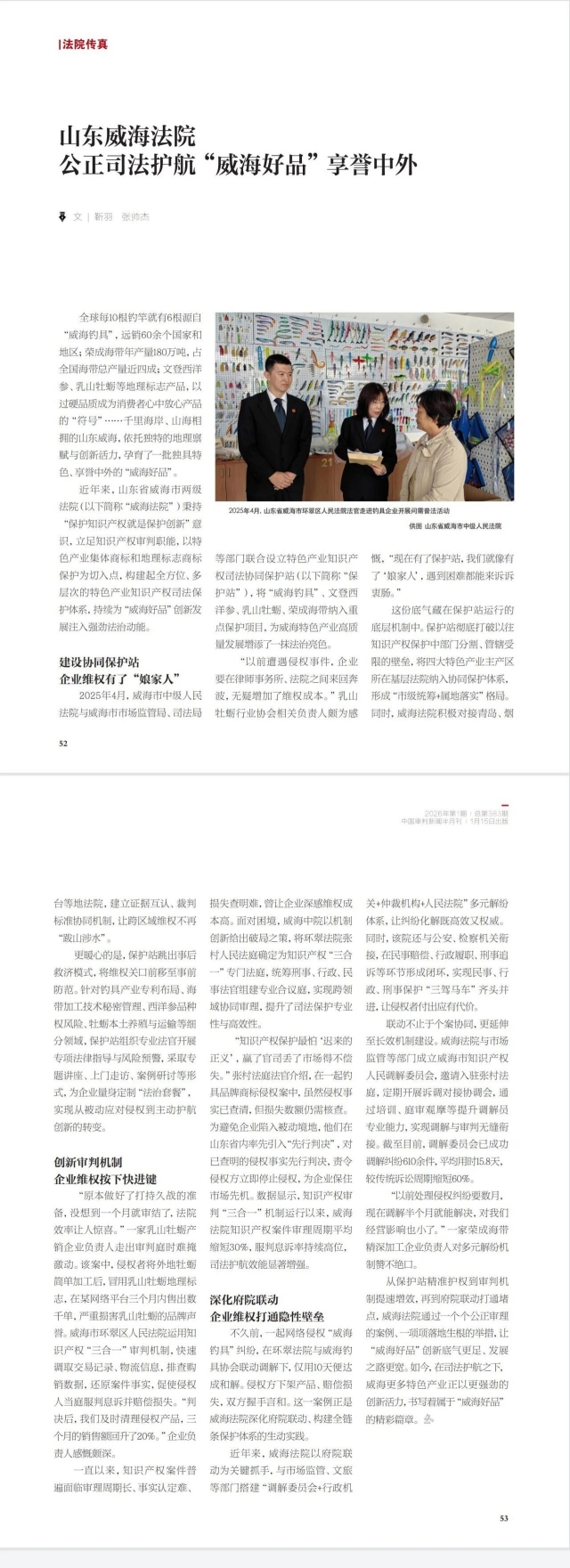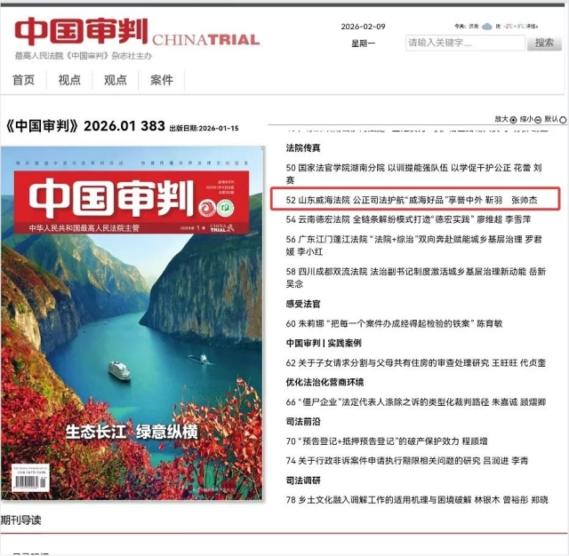 近日,《中國審判》以《山東威海法院 公正司法護航“威海好品”享譽中外》為題,報道威海法院秉持“保護知識產權就是保護創新”的司法理念,立足知識產權審判職能,以特色產業集體商標和地理標志商標保護為切入點,構建起全方位、多層次的特色產業知識產權司法保護體系,持續為“威海好品”創新發展注入強勁法治動能的經驗做法。以下為報道原文: