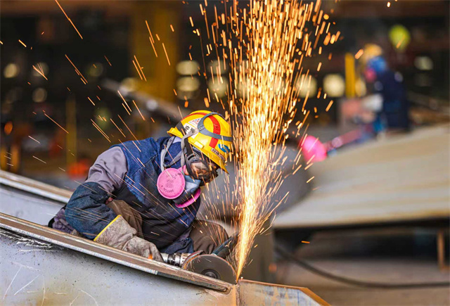 ????????在三星重工業(榮成)有限公司生產車間內,工人們趕制大型液化天然氣(LNG)運輸船船段。