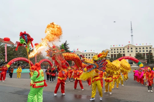 乳山市城區街道夏西村火龍大秧歌率先登場,雙龍盤旋、氣勢恢宏,特別是作為火龍大秧歌的秘傳絕技“雙龍噴火”,引得現場觀眾陣陣喝彩。作為省級非物質文化遺產項目,火龍大秧歌以剛勁有力的動作、跌宕起伏的隊形,充分展現了膠東民俗的獨特韻味。