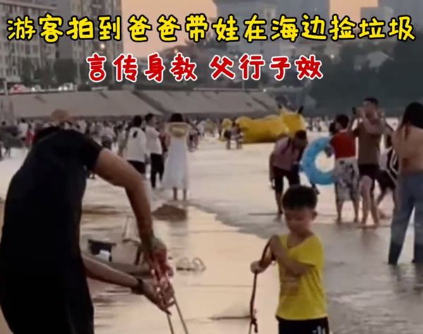 Hi視頻丨爸爸帶娃海邊撿垃圾,“言傳身教”有畫面了