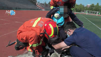 Hi視頻丨學(xué)生腿卡操場排水口 消防緊急救援
